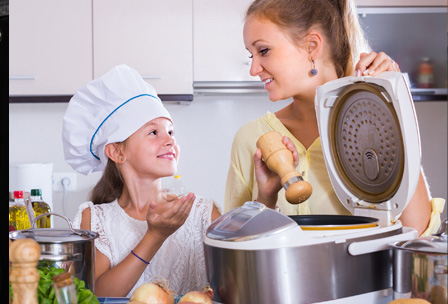 Smaller appliances, like toaster ovens, microwaves, and slow cookers, use less electricity to operate than a stove or oven, and can cook food more quickly. Using them helps reduce energy use during peak times and reduces costs.