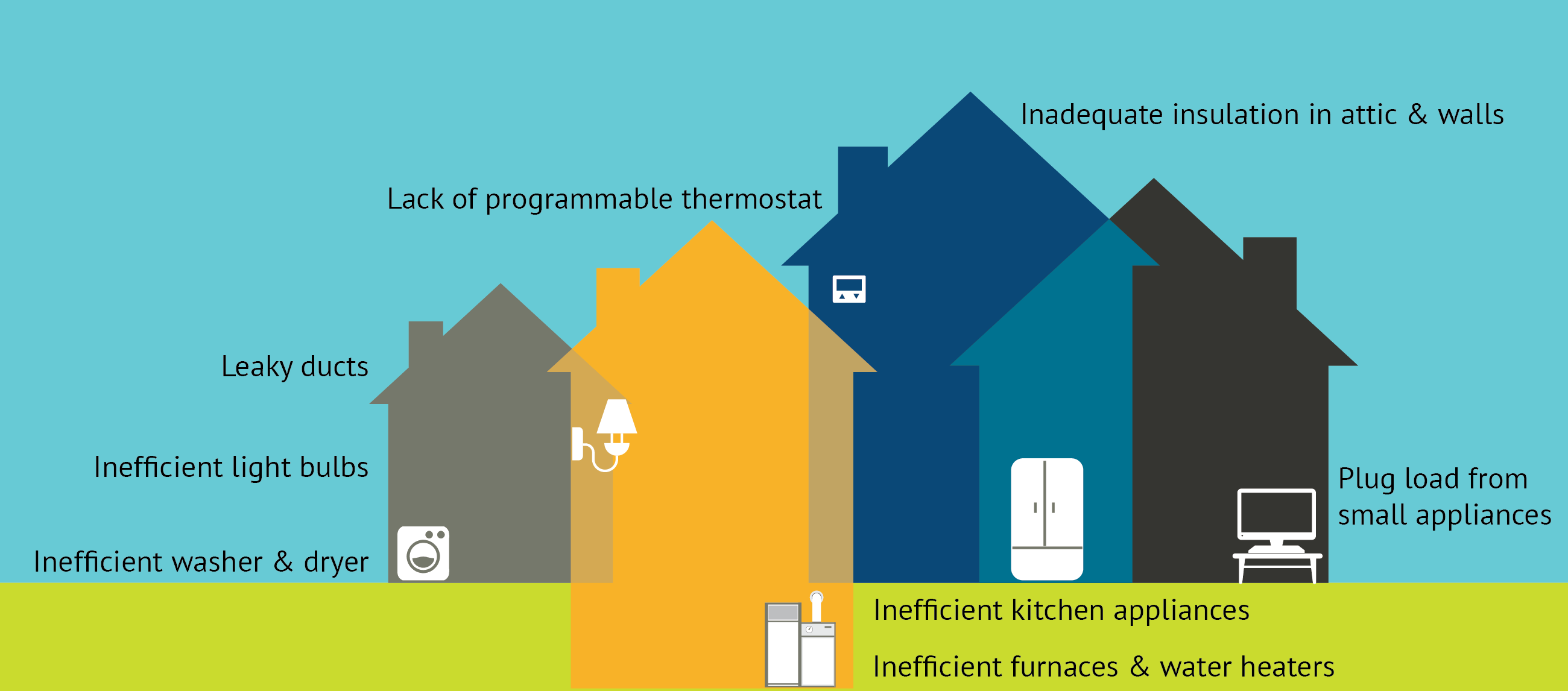 Your home uses energy throughout the day, for heating, cooling, cooking, lighting, entertainment and many other applications. In almost every home, the systems (e.g. air conditioners), building materials (e.g. insulation), appliances (e.g. washers), and lighting are usually not optimized for your specific needs or lifestyle There are many opportunities to use efficiency to save money, even after all costs, like equipment, installation, and financing, and government incentives, are taken into account.