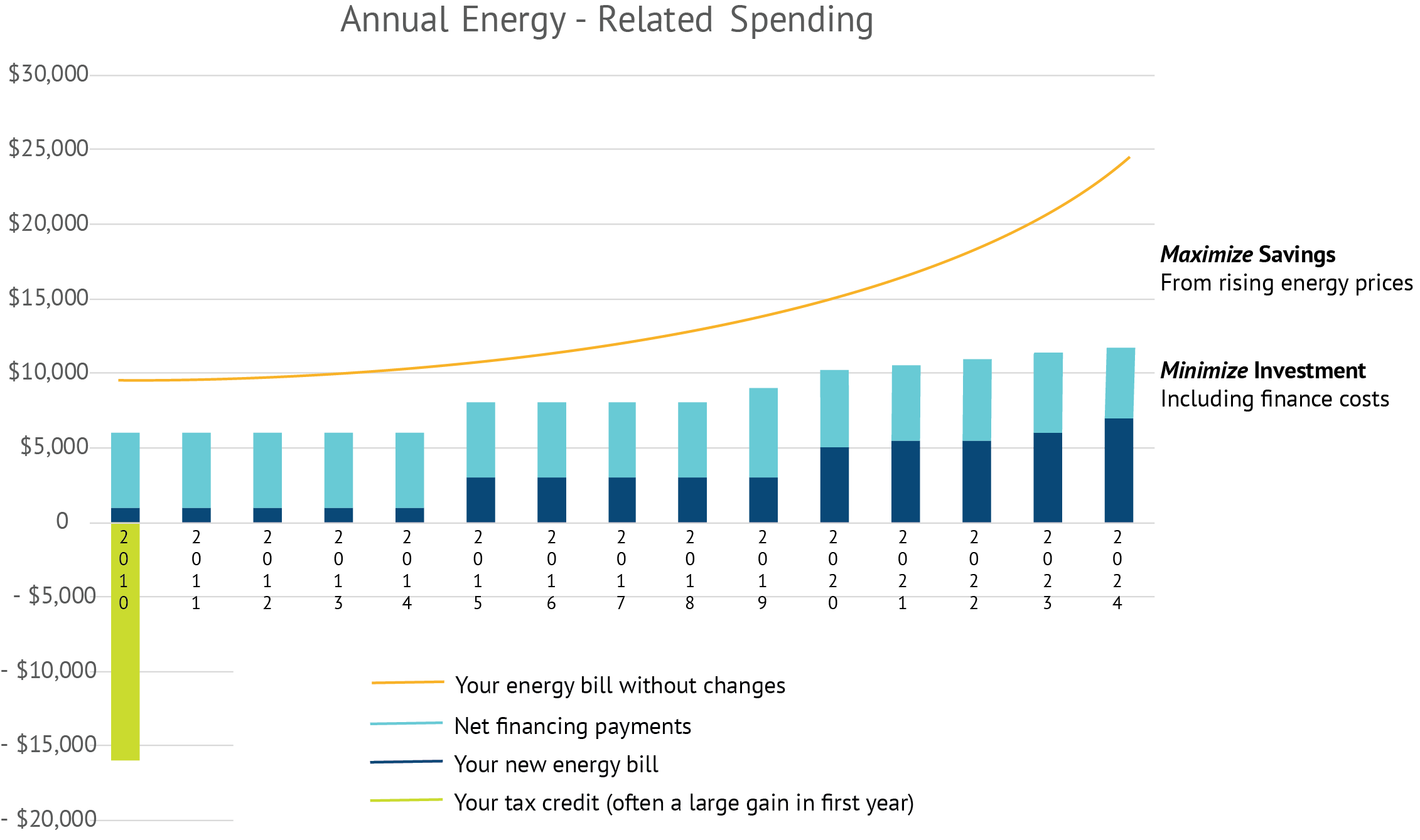 Many times, making investments in your home can lead to either a significant return or improve the comfort of your home. By making an energy action plan and then financing upgrades, often times you can pay little to nothing out of pocket and save immediately. In addition to the financing, tax credits often can put large amounts of cash straight into your pocket. In many cases these changes can significantly lower energy related spending, and with the ongoing steep increase in fuel prices they will get much larger as time goes by.