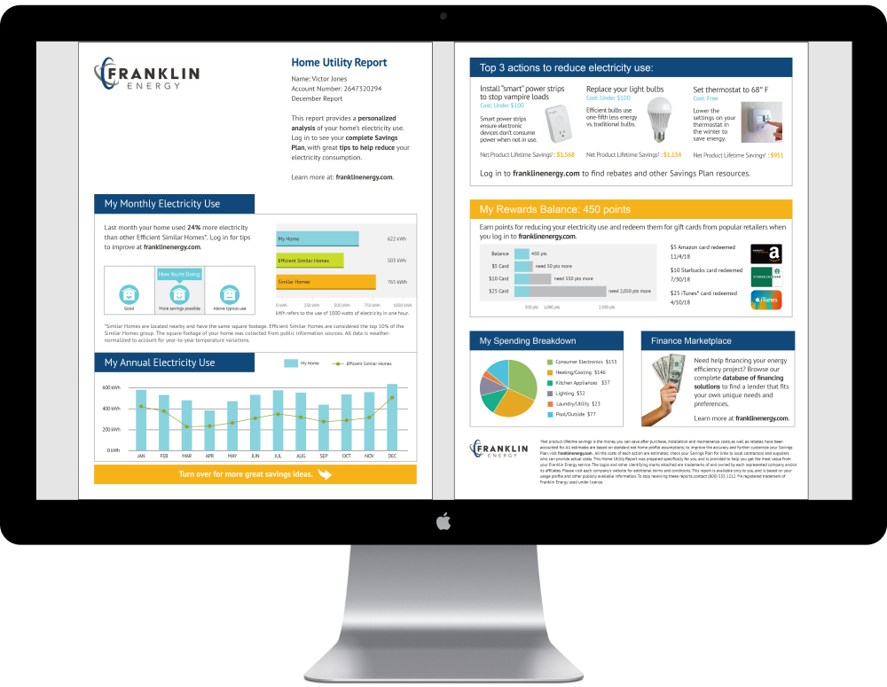 We provide Home Utility Reports to give you an easy to understand view of your usage and how you can save money on your monthly bills. The report compares your home’s energy efficiency over time, and to similar homes in your area, as well as provides you with a personalized set of actions that you can take to save. You can also log on to our web platform where you can change any assumptions (such as number of occupants or age of your home), further customize your action plan, and even get a list of local contractors who can help you with any energy efficiency needs.